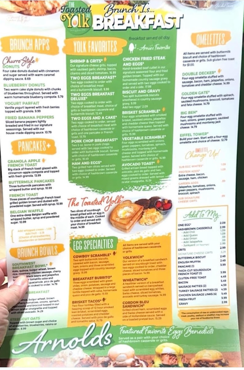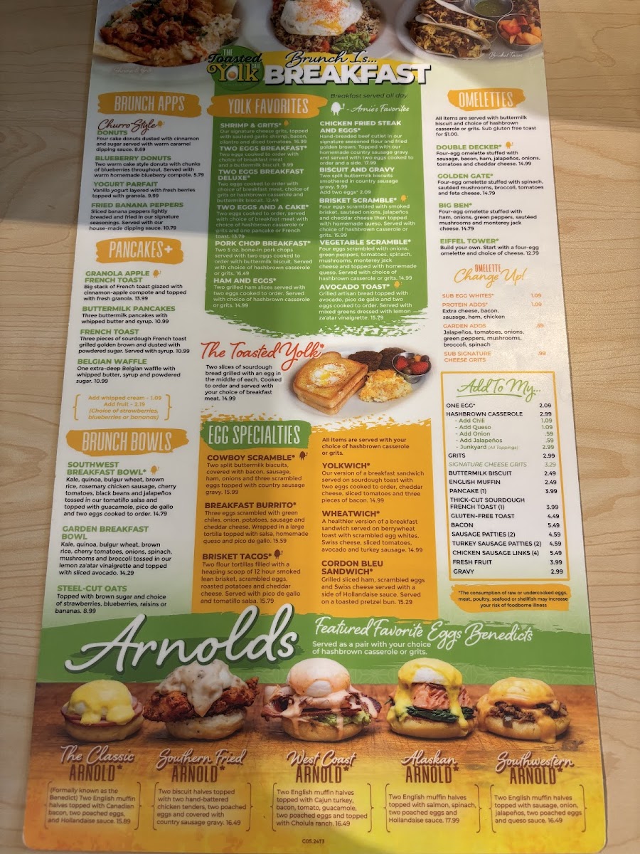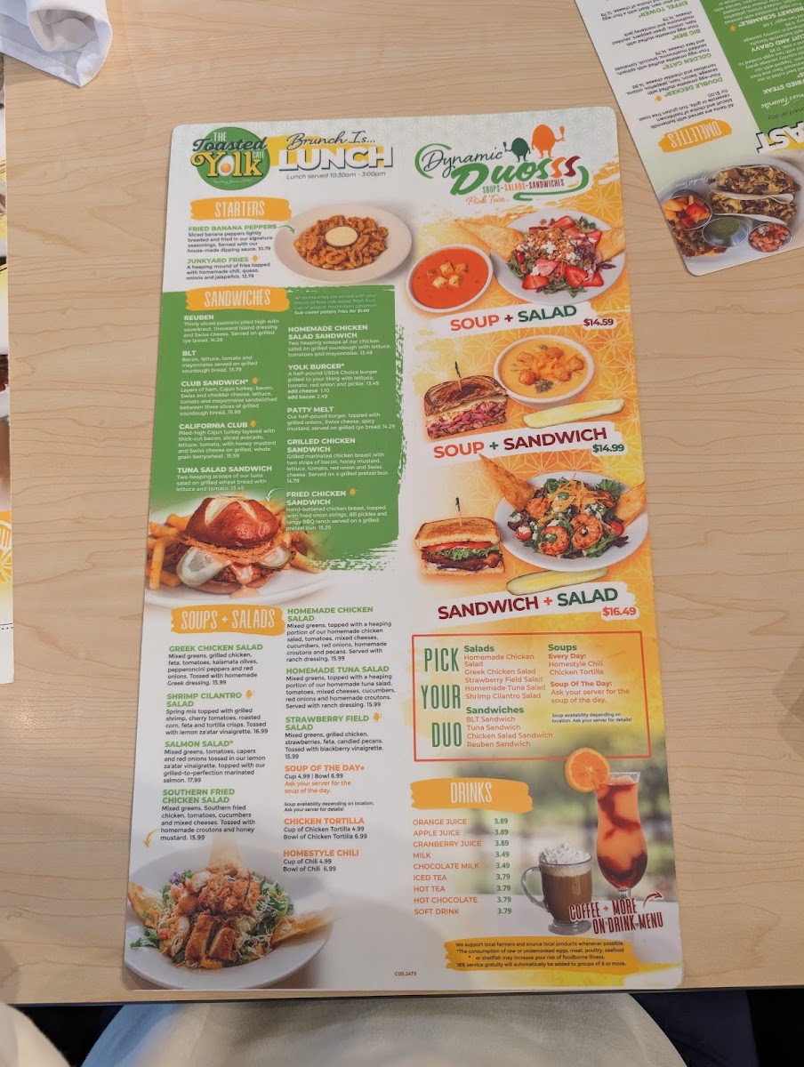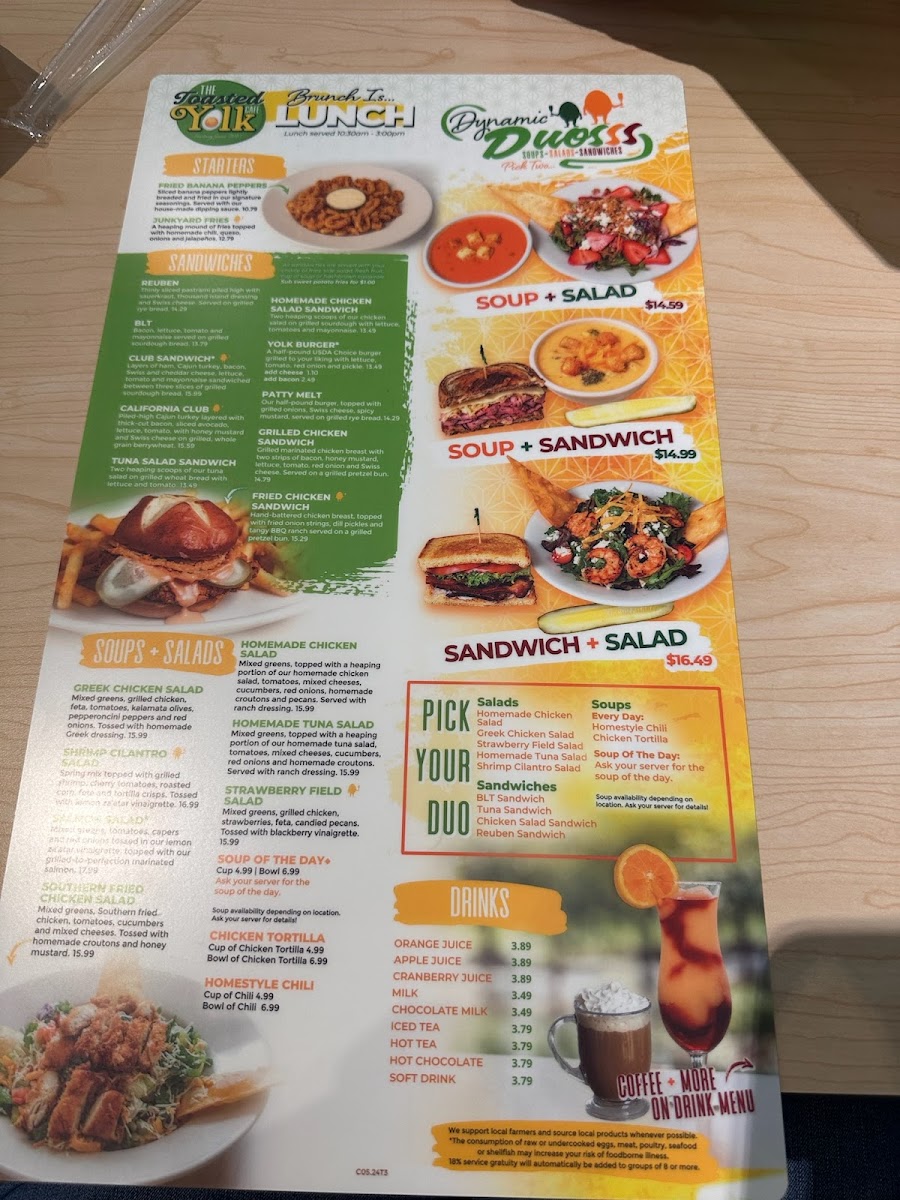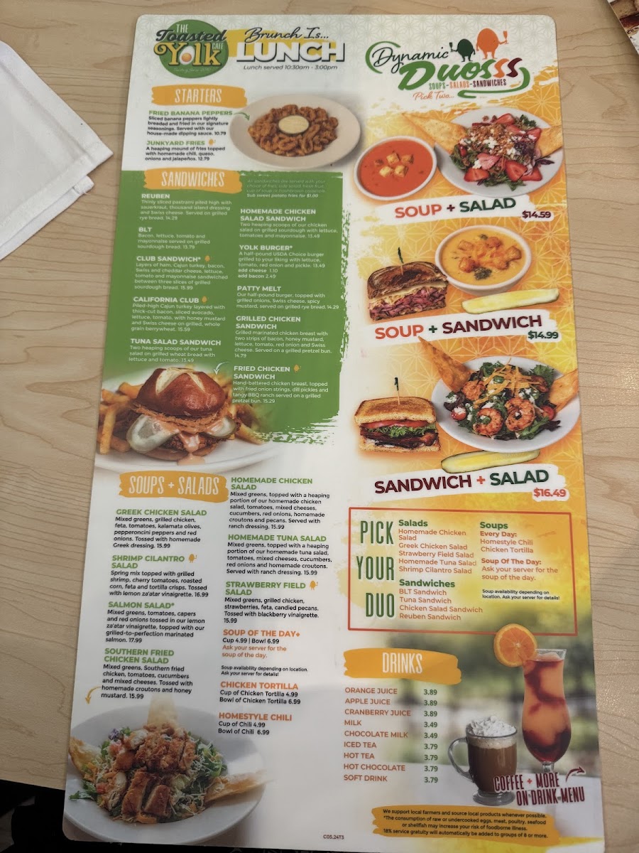 From a reviewer’s perspective, the menu at The Toasted Yolk Cafe offers a well-rounded and satisfying selection that caters to both indulgent cravings and lighter, health-conscious choices. The breakfast classics shine with items like French Toast - 3 Pc and Pancakes - 2 Pc, alongside more creative options such as the Belgian Waffle Lemon Ricotta Poppy Seed and Fire Roasted Peach Cobble. Signature dishes in the Yolk favorites section, including the Yolk Lover's Breakfast, Brisket Tacos, and the standout Hot Honey Chicken Biscuit, reflect a bold and flavorful approach. Sandwich lovers can enjoy hearty picks like the Fried Chicken Sandwich, Reuben Sandwich, and California Club Sandwich, while the omelette and scramble offerings-such as the Brisket Scramble and Cali Fresh Omelette-add variety. The shareables like Churro Donuts - 4 Pc and Blueberry Donuts provide a sweet finish, and lighter fare such as the Yogurt Parfait or Southwest Breakfast Bowl balances the menu nicely. Even the kids’ menu, with items like Kids Two Pancakes and Kids Chicken Tenders, ensures family-friendly appeal. Although prices aren’t prominently listed, the diversity and creativity across categories-from beverages like Cappuccino and Strawberry Lemonade to limited-time treats like the Breakfast Quesadilla-make the menu feel both approachable and thoughtfully curated, leaving a positive and lasting impression.