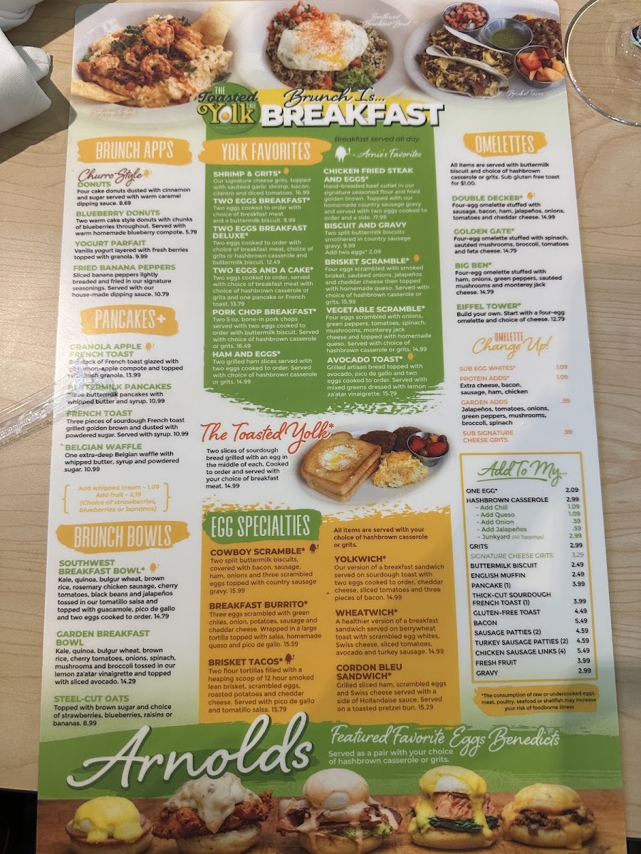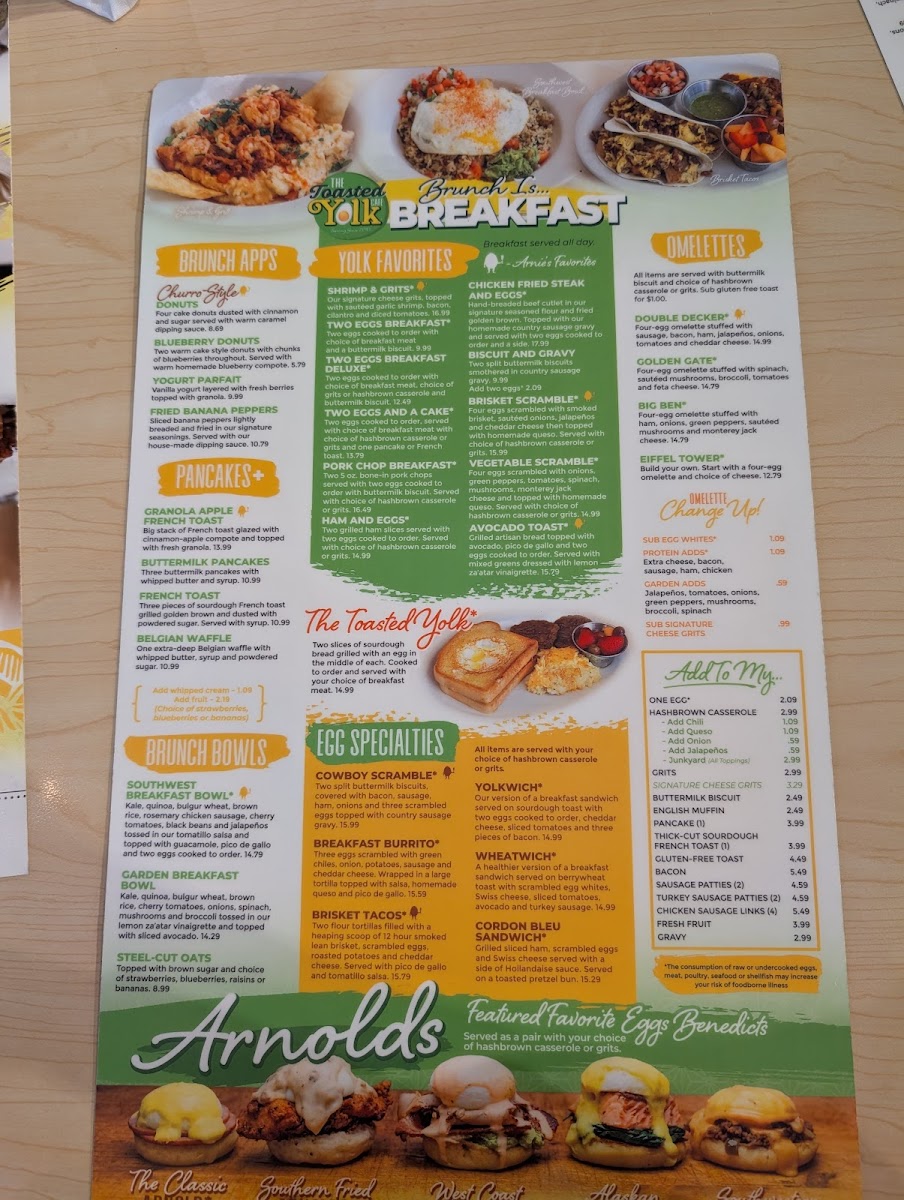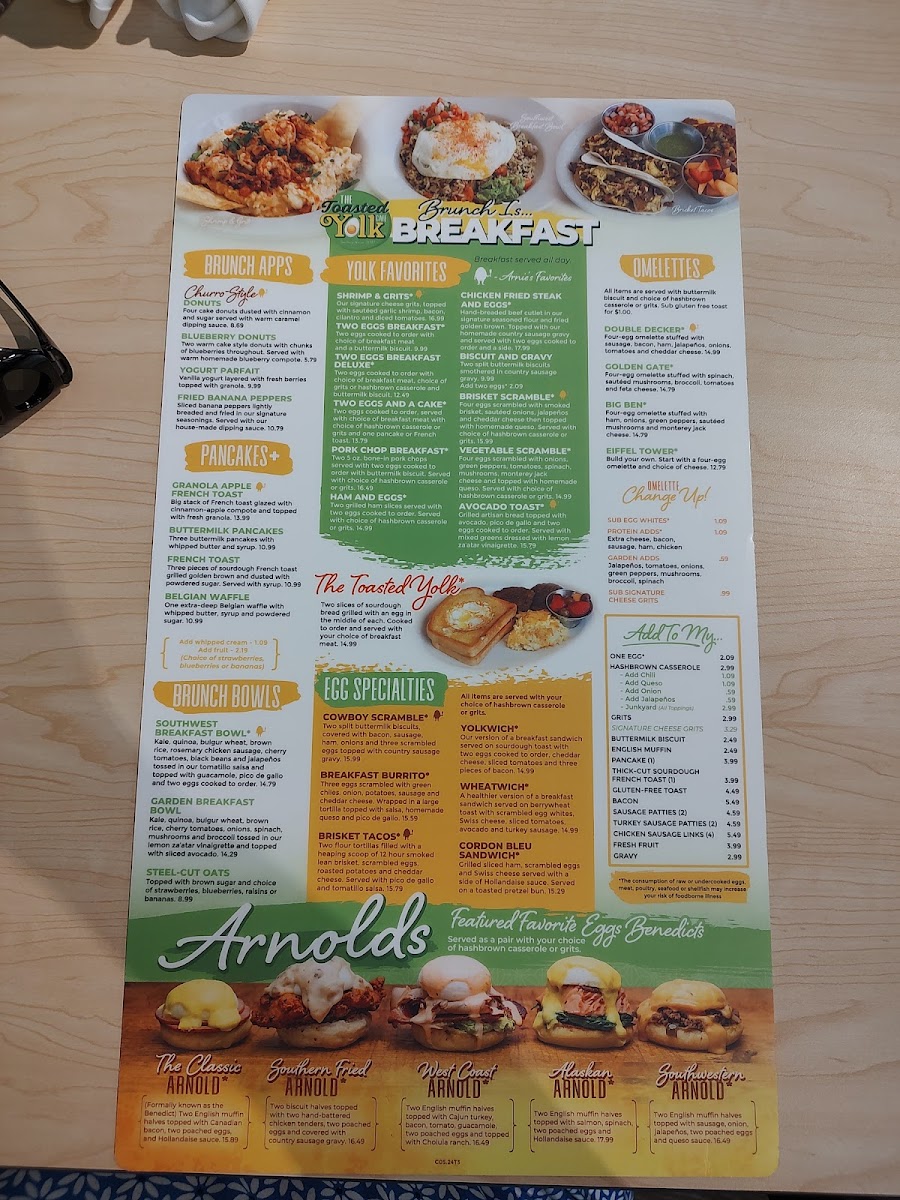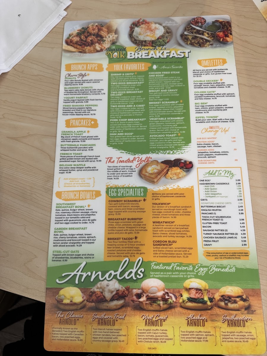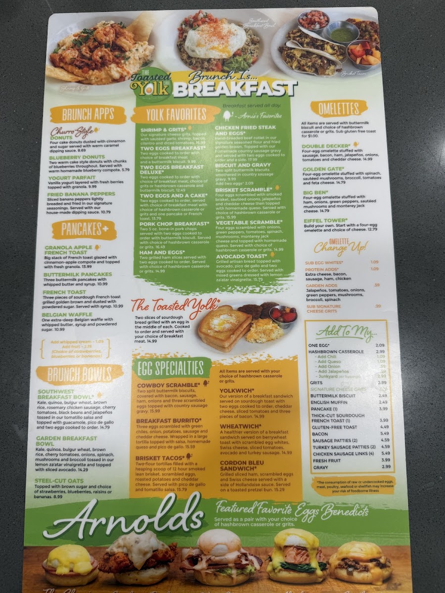 From a reviewer’s perspective, the menu at The Toasted Yolk Cafe offers a well-rounded and satisfying selection that caters to both indulgent cravings and lighter, health-conscious choices. The breakfast classics shine with items like French Toast - 3 Pc and Pancakes - 2 Pc, alongside more creative options such as the Belgian Waffle Lemon Ricotta Poppy Seed and Fire Roasted Peach Cobble. Signature dishes in the Yolk favorites section, including the Yolk Lover's Breakfast, Brisket Tacos, and the standout Hot Honey Chicken Biscuit, reflect a bold and flavorful approach. Sandwich lovers can enjoy hearty picks like the Fried Chicken Sandwich, Reuben Sandwich, and California Club Sandwich, while the omelette and scramble offerings-such as the Brisket Scramble and Cali Fresh Omelette-add variety. The shareables like Churro Donuts - 4 Pc and Blueberry Donuts provide a sweet finish, and lighter fare such as the Yogurt Parfait or Southwest Breakfast Bowl balances the menu nicely. Even the kids’ menu, with items like Kids Two Pancakes and Kids Chicken Tenders, ensures family-friendly appeal. Although prices aren’t prominently listed, the diversity and creativity across categories-from beverages like Cappuccino and Strawberry Lemonade to limited-time treats like the Breakfast Quesadilla-make the menu feel both approachable and thoughtfully curated, leaving a positive and lasting impression.